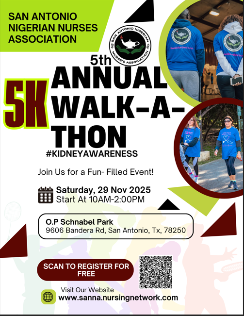 Join us for a fun-filled day of walking and community spirit at the 5th annual San Antonio Nigerian Nurse Association walk-a-thon!